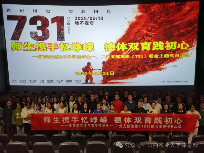 为深入贯彻落实习近平总书记在中国人民抗日战争暨世界反法西斯战争胜利80周年大会上的讲话精神,弘扬伟大抗战精神,深化爱国主义教育,引导师生铭记民族苦难,从历史中汲取奋进力量,9月24日,体育部党委与农学院学生第一、第二党支部联合开展“师生携手忆峥嵘,德体双育践初心”主题党日活动,组织师生共同观看了影片《731》,在回望历史中凝聚育人共识,在思想碰撞中践行初心使命。