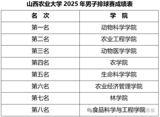 2025年11月5日,随着最后一记重扣落地,山西农业大学男子排球赛于睿智文体馆圆满收官。校党委常委、宣传统战部部长李文来和各学院领导为获奖队伍颁奖。本次比赛共吸引15支学院代表队、200余名运动员同台竞技,赛事期间累计上演36场精彩对决,扣杀、拦网、传接之间尽显排球运动的独特魅力,用热血与坚守谱写了山农校园的青春乐章。